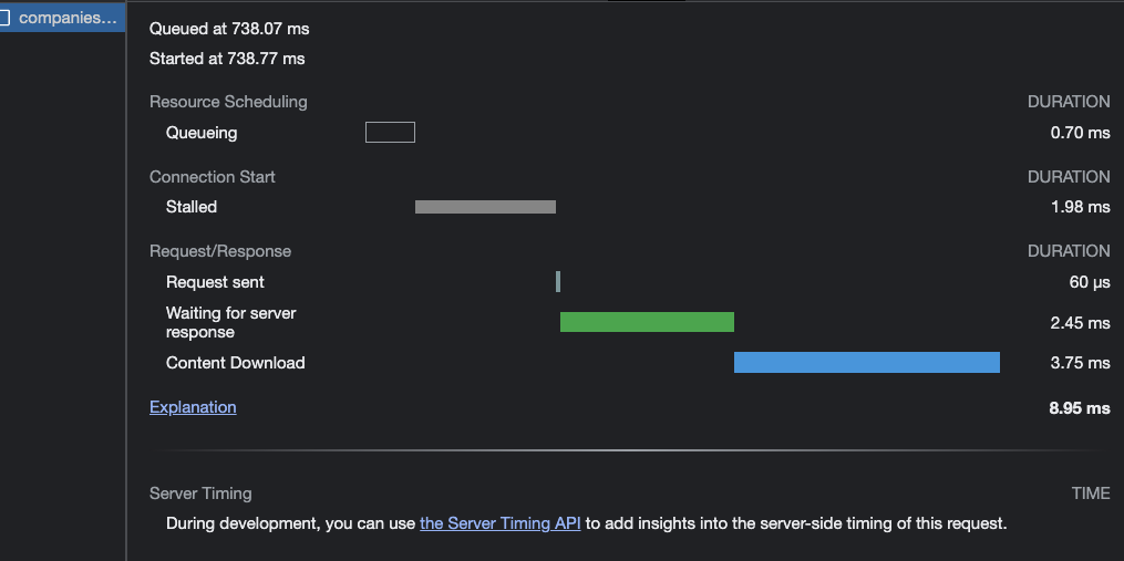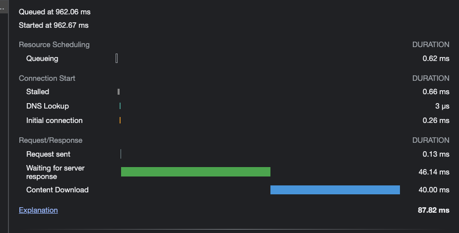 운영팀에서 주로 이 페이지에서 업무를 처리하는 만큼 "도매 매장들이 너무 늦게 뜹니다"와 같은 피드백을 받게 되었다. 네트워크 탭을 열어 확인해 본 결과 7천 개의 매장을 한 api를 통해 모두 불러오고 있었고, Timing탭을 통해 확인해 보니 최종 응답시간이 87.82ms로 측정되고 있었다.